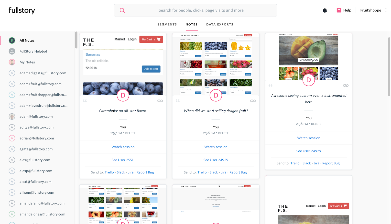 A useful feature of FullStory is the ability to take notes and comment on sessions during replay. Here's how it works: Let’s say you’re watching a FullStory session and you notice something you don’t want to forget, so you make a comment. The "Note" gets attached to the session recording at a specific moment, and a link is generated directly to that Note in FullStory. Notes make it easy to collaborate within or across teams. You can share Notes with other users from within FullStory—or share them via integration with tools like JIRA and Slack. Within the FullStory app, you can review the “All Notes” page to quickly see all of the recent notes left by you and others.