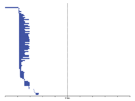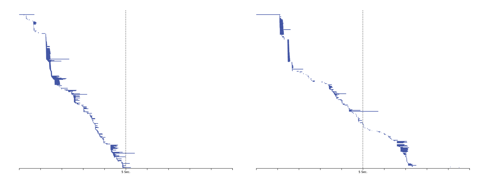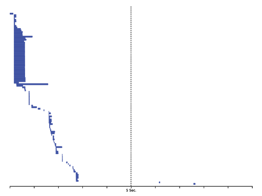 A simple solution to this problem would be to just wait a predetermined amount of time, say 5 seconds. But does this solution actually work? We recorded the network activity for a handful of websites out in the wild and compiled the data into the diagrams you see below. Each row represents an individual network request, moving from left to right through time, so rows stacked on top of one another indicate concurrent network requests.