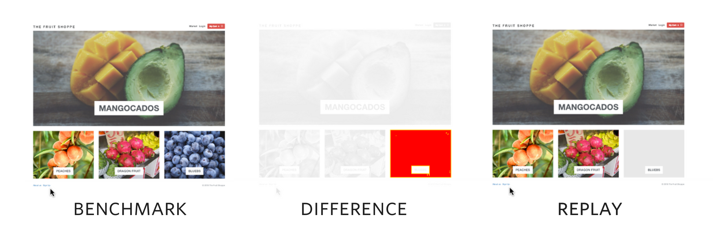 Above you can see the output of our visual regression test. The test compares the benchmark image (left) to the screen from the session recording (right), identifying any difference (middle image).