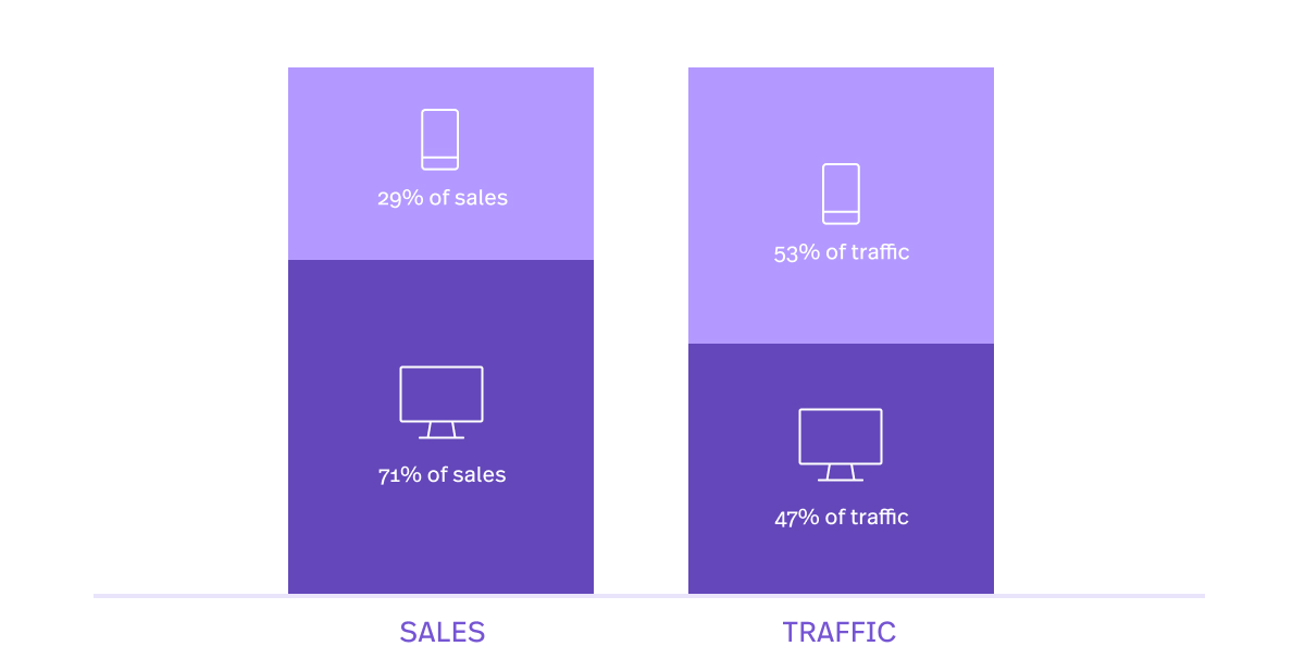 In 2020, across all industries, mobile visits accounted for 53% of website traffic, but only 29% of sales. Conversely, desktop users made up 47% of website traffic, and 71% of sales.