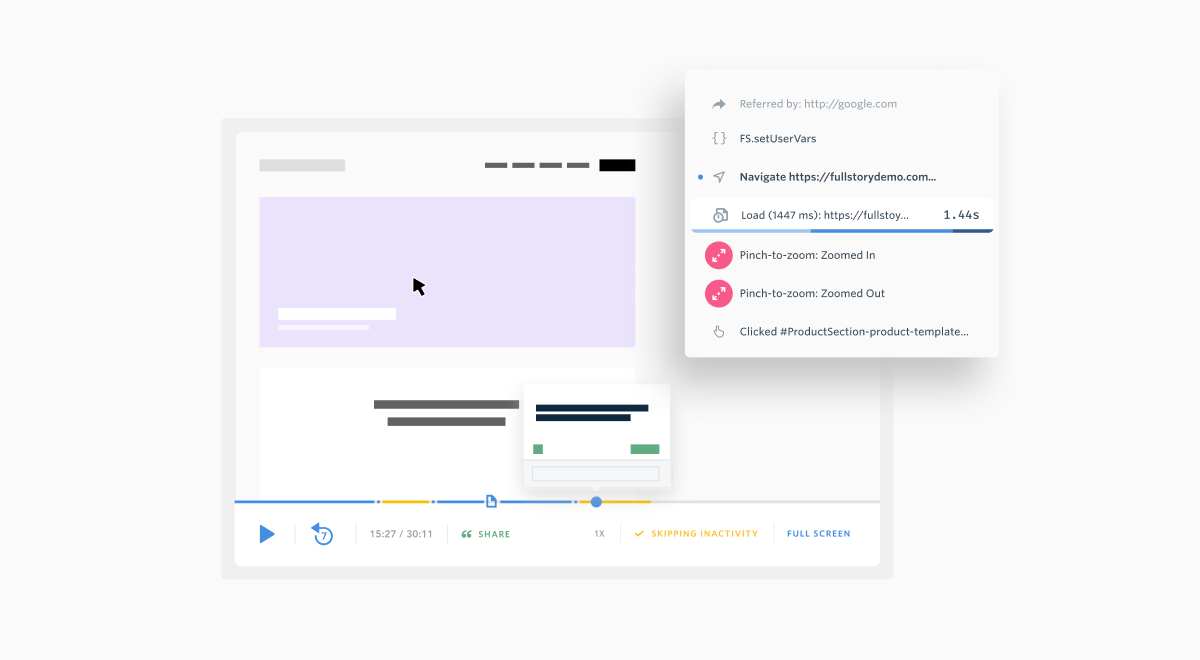 Example: Imagine you’re an ecommerce product manager, and you’re rolling out a new checkout option onto your site. You want to see how your customers are interacting with it, but because it’s new, your team hasn’t manually tagged it yet. FullStory’s Session Replay relies on instrumentation-free data, so there are no blindspots, even for new or updated elements.