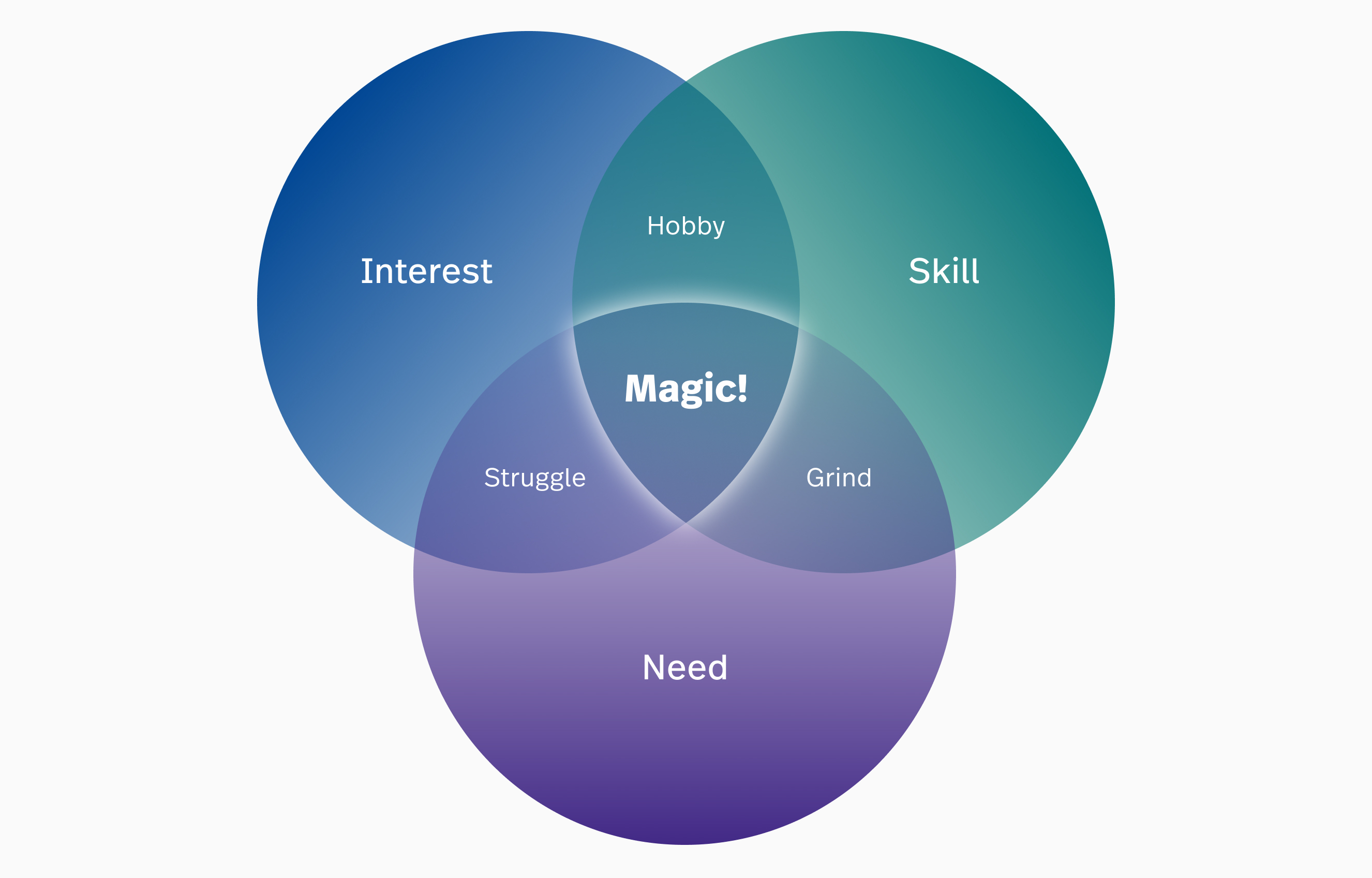 The intersection of interest, need and skill is where the magic happens. If you are keenly interested in a specific type of work, the business has a need for that type of work, and you have proven skills that map to the work, the best of all possible outcomes is achieved. The results are often successful, the business values that outcome, and you personally feel enriched and satisfied doing that work.
