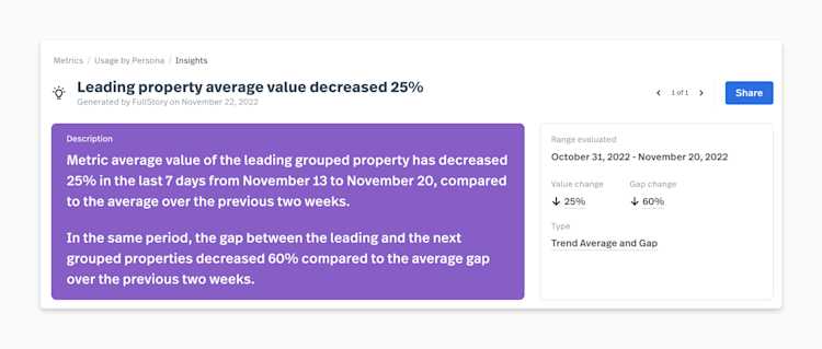 For metrics you want to investigate, FullStory harnesses your complete digital experience data to surface insights, without requiring you to build a performance dashboard. Machine learning illuminates key changes in your user data and shows you how patterns are shifting, keeping historical data context in mind.