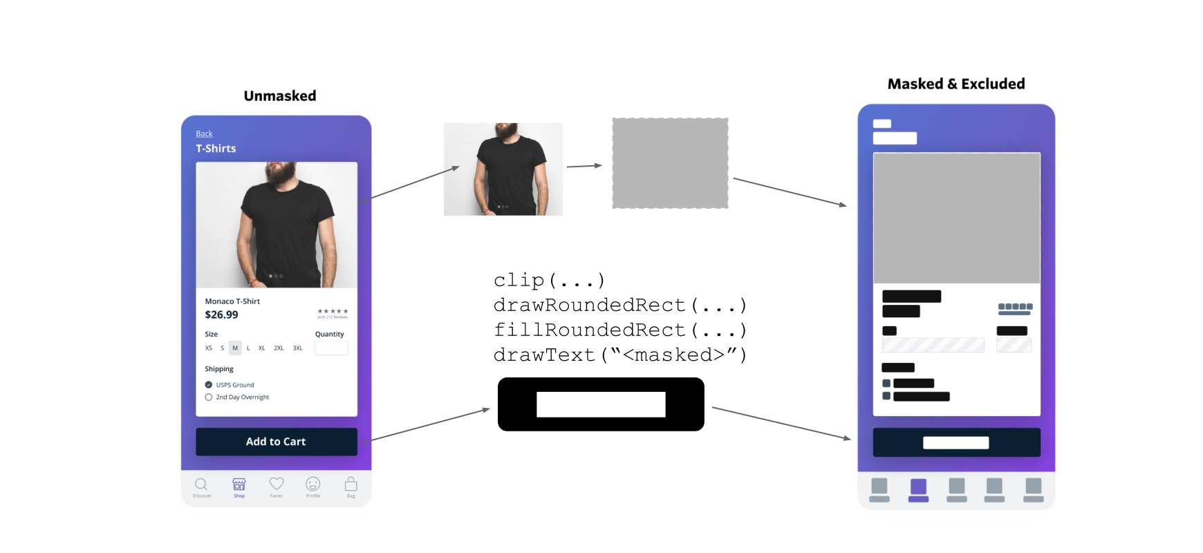 FullStory for Mobile Apps is based on a view hierarchy, enhanced with drawing operations. Because we have access to the underlying drawing commands, we are able to replace all textual information with an approximation of the underlying text bounds.