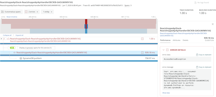 There are only two spans in this trace: the AWS Lambda function handler and the call to DynamoDB. If you copy/paste the FullStoryURL attribute value, you’ll be taken to the moment in the replay where the root span begins.