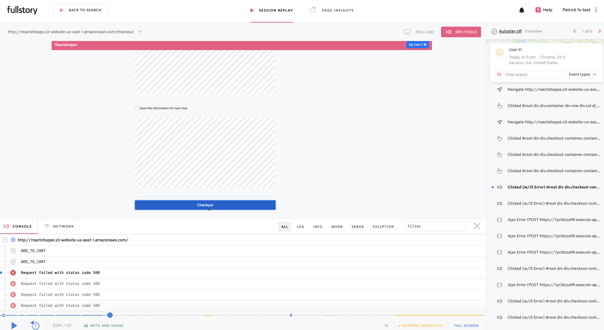 In this example, the trace pointed us to an issue in our system. The FullStory session replay gave us a view into the user impact of the error (it’s bad). Our intrepid engineering team now has all the data they need to prioritize a fix.
