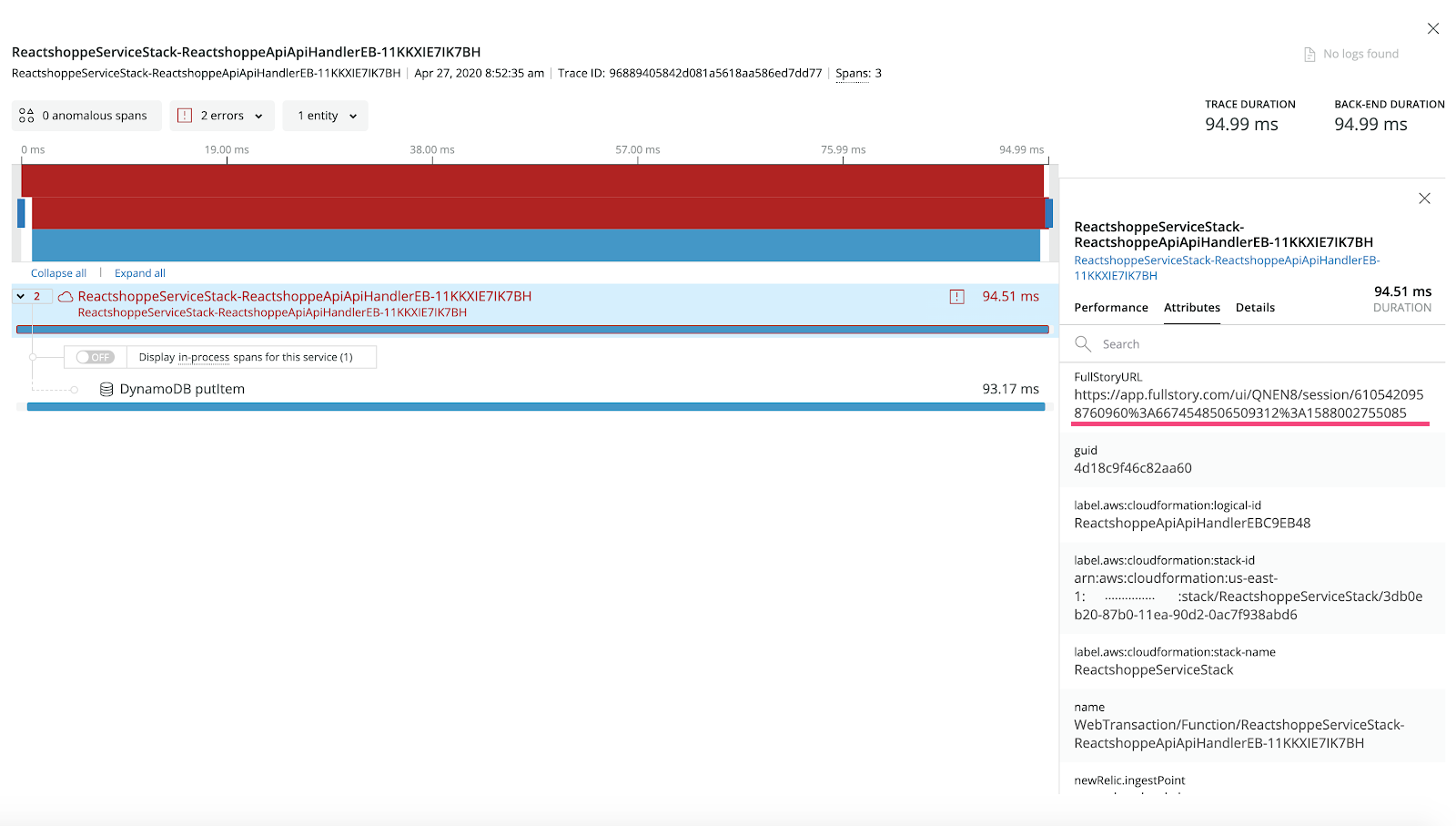 There are only two spans in this trace: the AWS Lambda function handler and the call to DynamoDB. If you copy/paste the FullStoryURL attribute value, you’ll be taken to the moment in the replay where the root span begins.