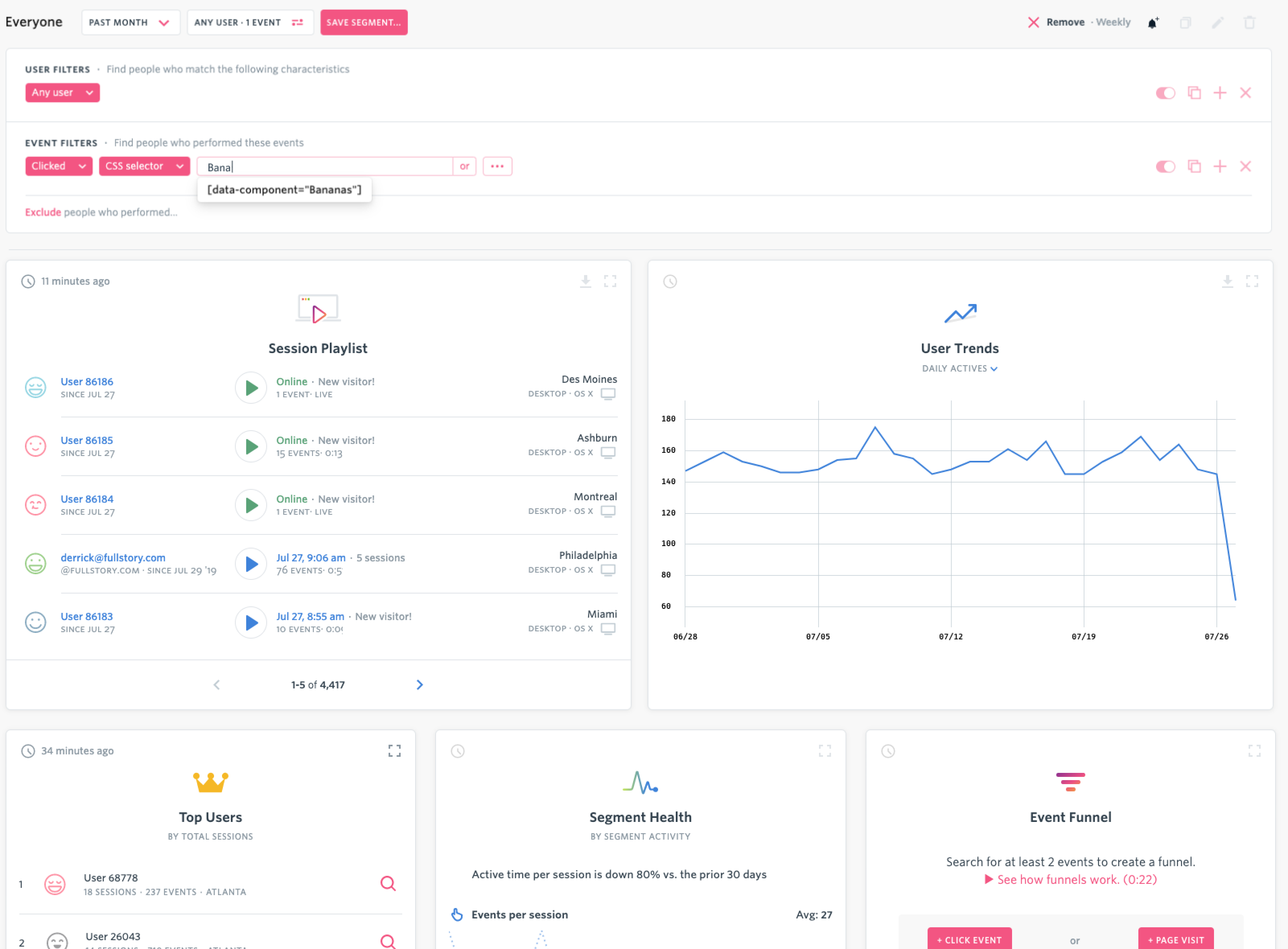 HTML5 introduced data attributes so developers could store additional metadata about HTML elements. FullStory supports data attribute search, which means that data attribute names and data can be used to search for interaction events.