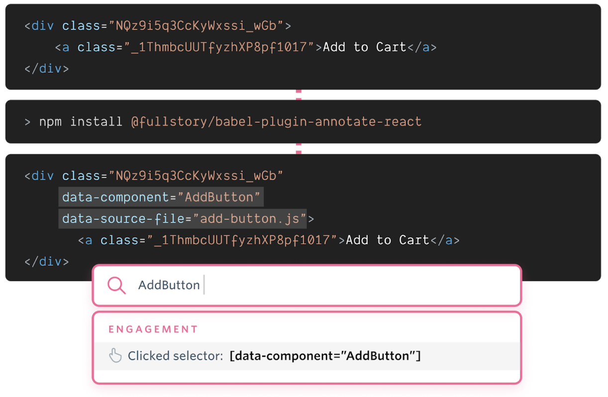 Taking inspiration from and building off of the awesome work David Sancho has done on the babel-plugin-transform-react-qa-classes project, we created a babel plugin that automatically adds data-component, data-element, and data-source-file attributes to React and React Native DOMs: @fullstory/babel-plugin-annotate-react. These values can be used to reliably identify page elements for end-to-end testing and when trying to understand user behavior (and protect user privacy) in FullStory.